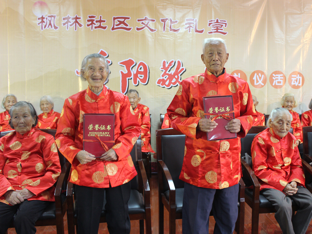 北仑:枫林文化礼堂重阳敬老礼上两位年近百岁老人的灿烂笑容