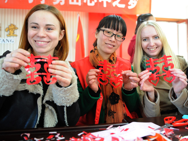 鄞州:前溪头村文化礼堂外国人剪窗花